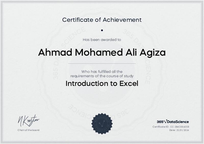 This user has been awarded the Introduction to Excel Certificate for successfully completing the course exam. Holding this certificate demonstrates their proficiency on the topic and signifies they are qualified to apply their newly acquired expertise in the fields of data analytics and data science.