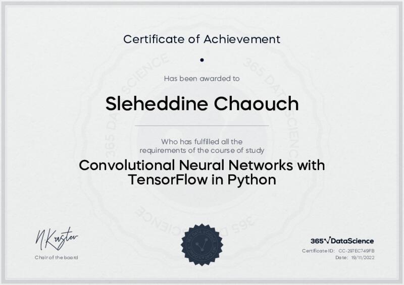 This user has been awarded the Convolutional Neural Networks with TensorFlow in Python Certificate for successfully completing the course exam. Holding this certificate demonstrates their proficiency on the topic and signifies they are qualified to apply their newly acquired expertise in the fields of data analytics and data science.