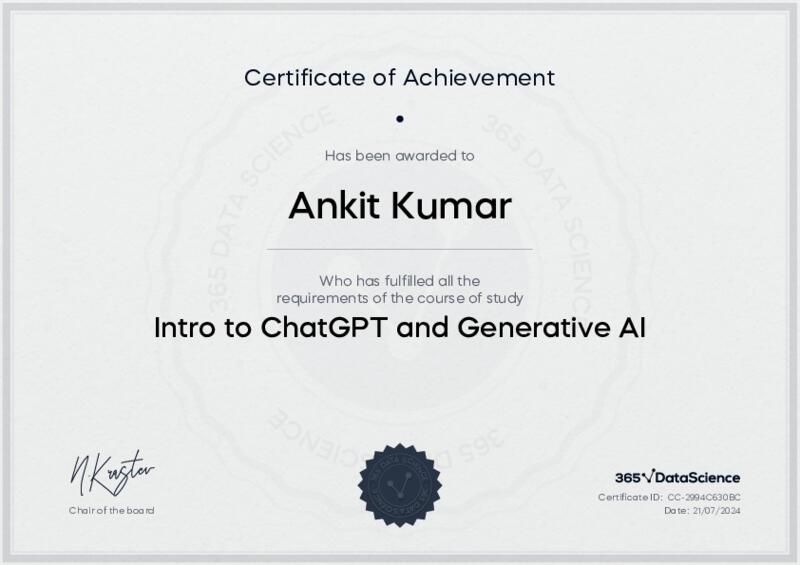 This user has been awarded the Intro to ChatGPT and Generative AI Certificate for successfully completing the course exam. Holding this certificate demonstrates their proficiency on the topic and signifies they are qualified to apply their newly acquired expertise in the fields of data analytics and data science.