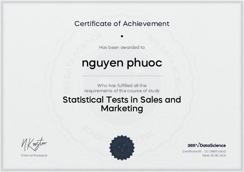 This user has been awarded the Statistical Tests in Sales and Marketing Certificate for successfully completing the course exam. Holding this certificate demonstrates their proficiency on the topic and signifies they are qualified to apply their newly acquired expertise in the fields of data analytics and data science.