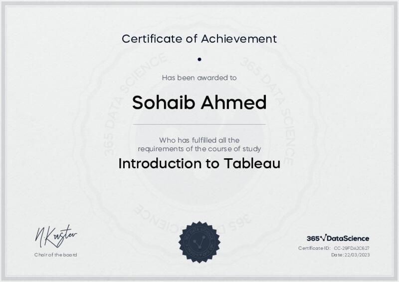 This user has been awarded the Introduction to Tableau Certificate for successfully completing the course exam. Holding this certificate demonstrates their proficiency on the topic and signifies they are qualified to apply their newly acquired expertise in the fields of data analytics and data science.