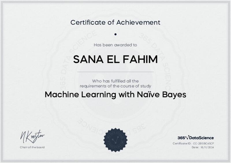 This user has been awarded the Machine Learning with Naïve Bayes Certificate for successfully completing the course exam. Holding this certificate demonstrates their proficiency on the topic and signifies they are qualified to apply their newly acquired expertise in the fields of data analytics and data science.