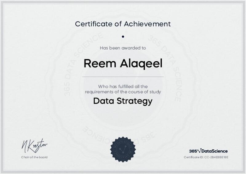 This user has been awarded the Data Strategy Certificate for successfully completing the course exam. Holding this certificate demonstrates their proficiency on the topic and signifies they are qualified to apply their newly acquired expertise in the fields of data analytics and data science.