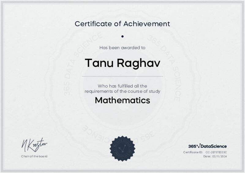 This user has been awarded the Mathematics Certificate for successfully completing the course exam. Holding this certificate demonstrates their proficiency on the topic and signifies they are qualified to apply their newly acquired expertise in the fields of data analytics and data science.