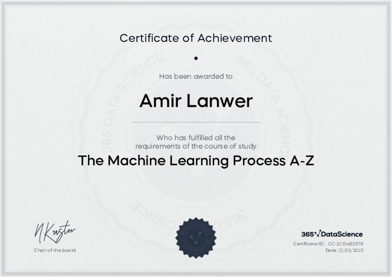 This user has been awarded the The Machine Learning Process A-Z Certificate for successfully completing the course exam. Holding this certificate demonstrates their proficiency on the topic and signifies they are qualified to apply their newly acquired expertise in the fields of data analytics and data science.