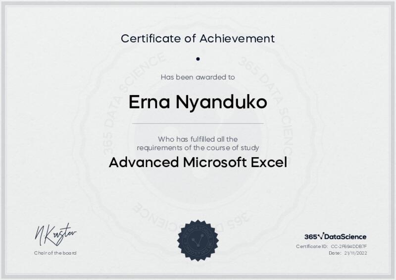 This user has been awarded the Advanced Microsoft Excel Certificate for successfully completing the course exam. Holding this certificate demonstrates their proficiency on the topic and signifies they are qualified to apply their newly acquired expertise in the fields of data analytics and data science.