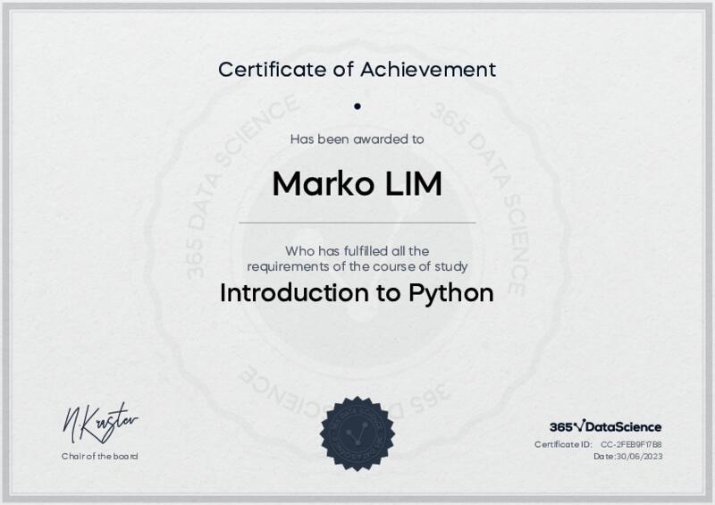 This user has been awarded the Introduction to Python Certificate for successfully completing the course exam. Holding this certificate demonstrates their proficiency on the topic and signifies they are qualified to apply their newly acquired expertise in the fields of data analytics and data science.