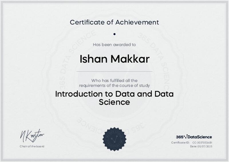 This user has been awarded the Introduction to Data and Data Science Certificate for successfully completing the course exam. Holding this certificate demonstrates their proficiency on the topic and signifies they are qualified to apply their newly acquired expertise in the fields of data analytics and data science.