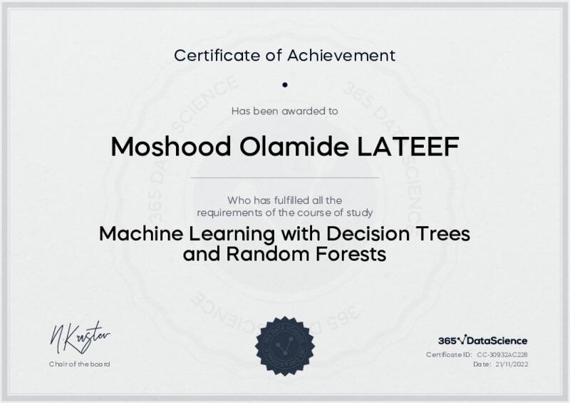 This user has been awarded the Machine Learning with Decision Trees and Random Forests Certificate for successfully completing the course exam. Holding this certificate demonstrates their proficiency on the topic and signifies they are qualified to apply their newly acquired expertise in the fields of data analytics and data science.