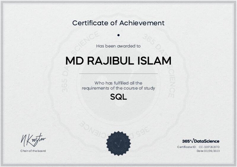 This user has been awarded the SQL Certificate for successfully completing the course exam. Holding this certificate demonstrates their proficiency on the topic and signifies they are qualified to apply their newly acquired expertise in the fields of data analytics and data science.