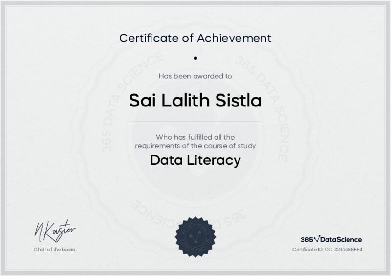 This user has been awarded the Data Literacy Certificate for successfully completing the course exam. Holding this certificate demonstrates their proficiency on the topic and signifies they are qualified to apply their newly acquired expertise in the fields of data analytics and data science.