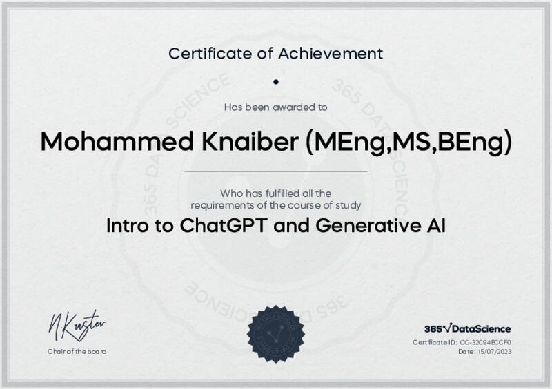 This user has been awarded the Intro to ChatGPT and Generative AI Certificate for successfully completing the course exam. Holding this certificate demonstrates their proficiency on the topic and signifies they are qualified to apply their newly acquired expertise in the fields of data analytics and data science.