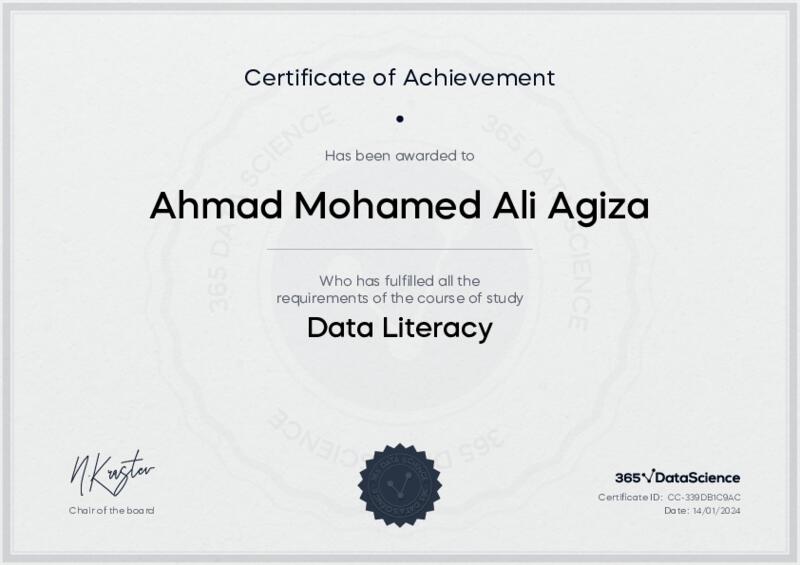 This user has been awarded the Data Literacy Certificate for successfully completing the course exam. Holding this certificate demonstrates their proficiency on the topic and signifies they are qualified to apply their newly acquired expertise in the fields of data analytics and data science.