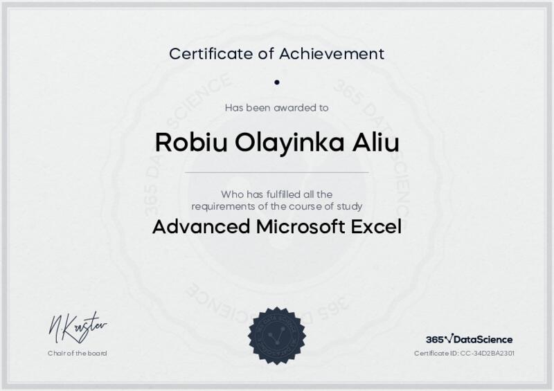 This user has been awarded the Advanced Microsoft Excel Certificate for successfully completing the course exam. Holding this certificate demonstrates their proficiency on the topic and signifies they are qualified to apply their newly acquired expertise in the fields of data analytics and data science.