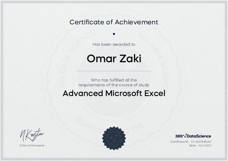 This user has been awarded the Advanced Microsoft Excel Certificate for successfully completing the course exam. Holding this certificate demonstrates their proficiency on the topic and signifies they are qualified to apply their newly acquired expertise in the fields of data analytics and data science.