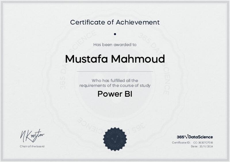This user has been awarded the Power BI Certificate for successfully completing the course exam. Holding this certificate demonstrates their proficiency on the topic and signifies they are qualified to apply their newly acquired expertise in the fields of data analytics and data science.
