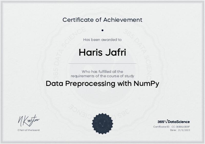 This user has been awarded the Data Preprocessing with NumPy Certificate for successfully completing the course exam. Holding this certificate demonstrates their proficiency on the topic and signifies they are qualified to apply their newly acquired expertise in the fields of data analytics and data science.