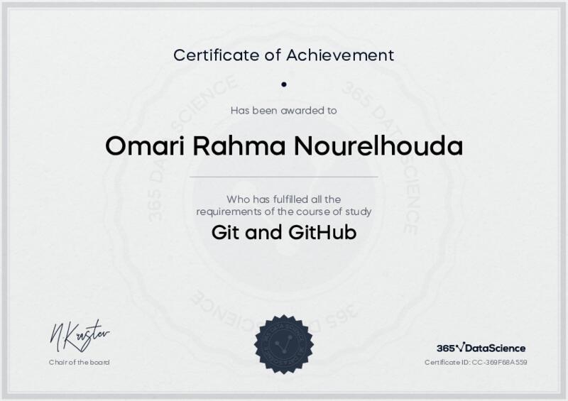 This user has been awarded the Git and GitHub Certificate for successfully completing the course exam. Holding this certificate demonstrates their proficiency on the topic and signifies they are qualified to apply their newly acquired expertise in the fields of data analytics and data science.