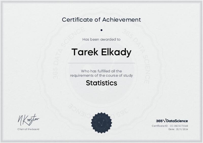 This user has been awarded the Statistics Certificate for successfully completing the course exam. Holding this certificate demonstrates their proficiency on the topic and signifies they are qualified to apply their newly acquired expertise in the fields of data analytics and data science.