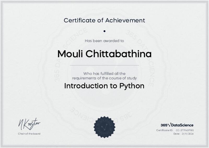 This user has been awarded the Introduction to Python Certificate for successfully completing the course exam. Holding this certificate demonstrates their proficiency on the topic and signifies they are qualified to apply their newly acquired expertise in the fields of data analytics and data science.