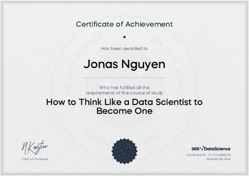 This user has been awarded the How to Think Like a Data Scientist to Become One Certificate for successfully completing the course exam. Holding this certificate demonstrates their proficiency on the topic and signifies they are qualified to apply their newly acquired expertise in the fields of data analytics and data science.