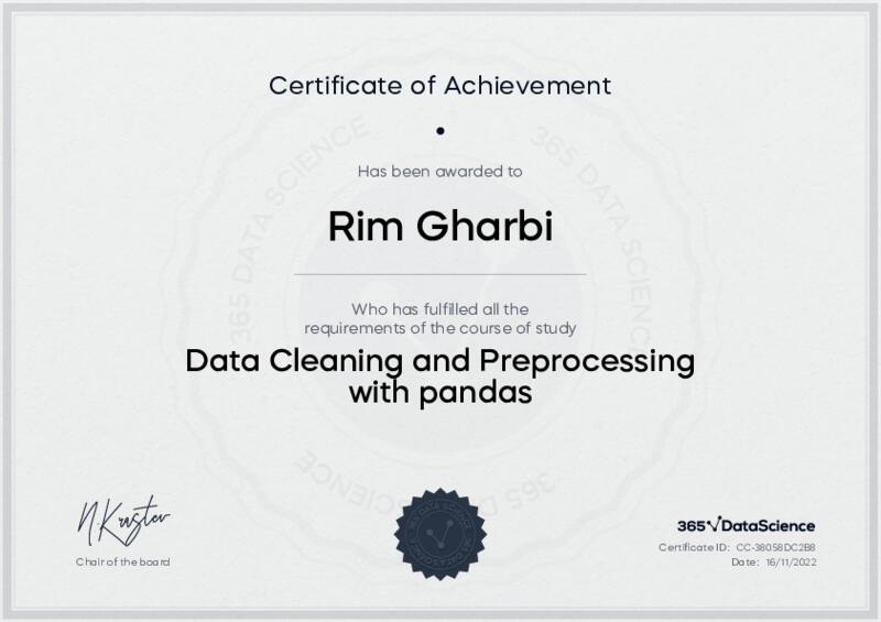 This user has been awarded the Data Cleaning and Preprocessing with pandas Certificate for successfully completing the course exam. Holding this certificate demonstrates their proficiency on the topic and signifies they are qualified to apply their newly acquired expertise in the fields of data analytics and data science.