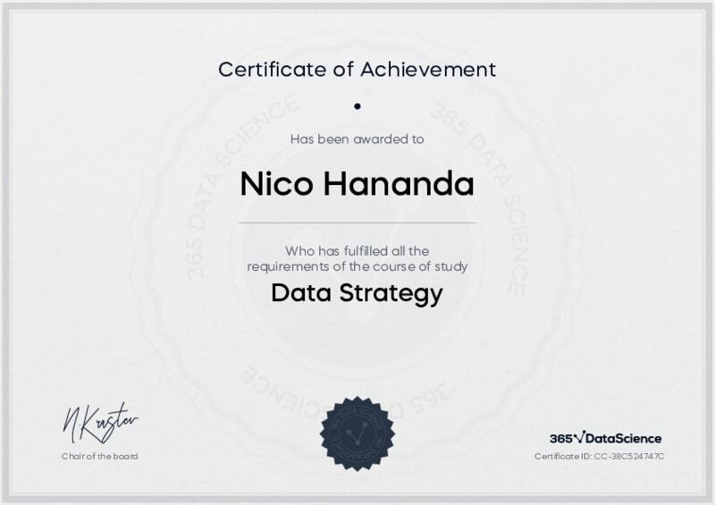 This user has been awarded the Data Strategy Certificate for successfully completing the course exam. Holding this certificate demonstrates their proficiency on the topic and signifies they are qualified to apply their newly acquired expertise in the fields of data analytics and data science.