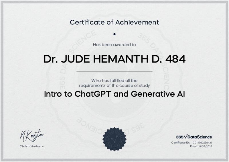 This user has been awarded the Intro to ChatGPT and Generative AI Certificate for successfully completing the course exam. Holding this certificate demonstrates their proficiency on the topic and signifies they are qualified to apply their newly acquired expertise in the fields of data analytics and data science.