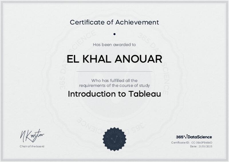 This user has been awarded the Introduction to Tableau Certificate for successfully completing the course exam. Holding this certificate demonstrates their proficiency on the topic and signifies they are qualified to apply their newly acquired expertise in the fields of data analytics and data science.