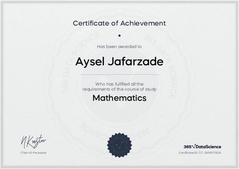 This user has been awarded the Mathematics Certificate for successfully completing the course exam. Holding this certificate demonstrates their proficiency on the topic and signifies they are qualified to apply their newly acquired expertise in the fields of data analytics and data science.