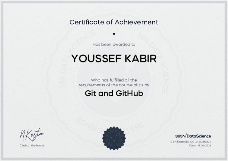 This user has been awarded the Git and GitHub Certificate for successfully completing the course exam. Holding this certificate demonstrates their proficiency on the topic and signifies they are qualified to apply their newly acquired expertise in the fields of data analytics and data science.