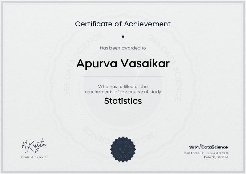 This user has been awarded the Statistics Certificate for successfully completing the course exam. Holding this certificate demonstrates their proficiency on the topic and signifies they are qualified to apply their newly acquired expertise in the fields of data analytics and data science.