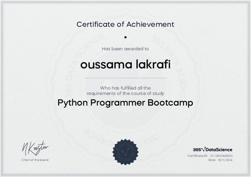 This user has been awarded the Python Programmer Bootcamp Certificate for successfully completing the course exam. Holding this certificate demonstrates their proficiency on the topic and signifies they are qualified to apply their newly acquired expertise in the fields of data analytics and data science.