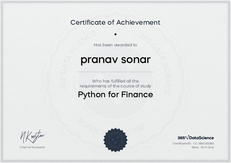 This user has been awarded the Python for Finance Certificate for successfully completing the course exam. Holding this certificate demonstrates their proficiency on the topic and signifies they are qualified to apply their newly acquired expertise in the fields of data analytics and data science.