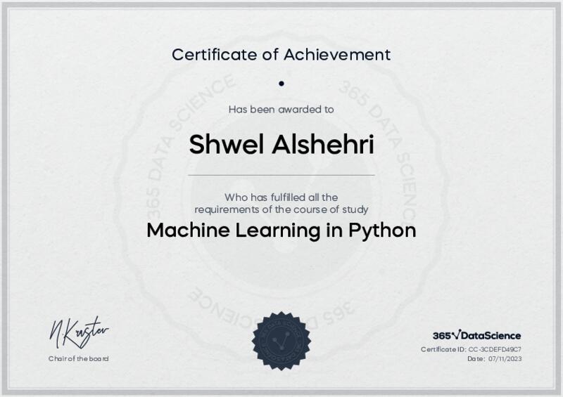 This user has been awarded the Machine Learning in Python Certificate for successfully completing the course exam. Holding this certificate demonstrates their proficiency on the topic and signifies they are qualified to apply their newly acquired expertise in the fields of data analytics and data science.