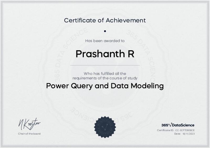 This user has been awarded the Power Query and Data Modeling Certificate for successfully completing the course exam. Holding this certificate demonstrates their proficiency on the topic and signifies they are qualified to apply their newly acquired expertise in the fields of data analytics and data science.