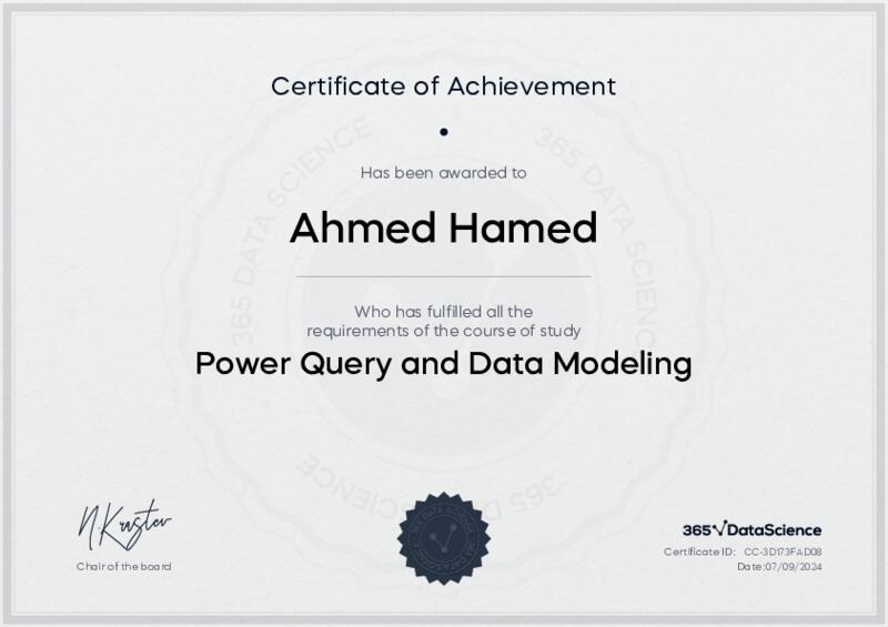 This user has been awarded the Power Query and Data Modeling Certificate for successfully completing the course exam. Holding this certificate demonstrates their proficiency on the topic and signifies they are qualified to apply their newly acquired expertise in the fields of data analytics and data science.