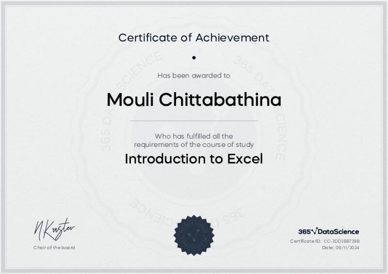 This user has been awarded the Introduction to Excel Certificate for successfully completing the course exam. Holding this certificate demonstrates their proficiency on the topic and signifies they are qualified to apply their newly acquired expertise in the fields of data analytics and data science.