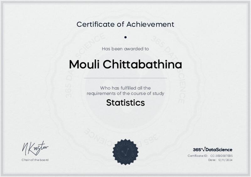 This user has been awarded the Statistics Certificate for successfully completing the course exam. Holding this certificate demonstrates their proficiency on the topic and signifies they are qualified to apply their newly acquired expertise in the fields of data analytics and data science.