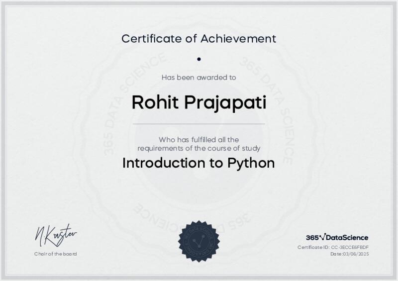 This user has been awarded the Introduction to Python Certificate for successfully completing the course exam. Holding this certificate demonstrates their proficiency on the topic and signifies they are qualified to apply their newly acquired expertise in the fields of data analytics and data science.