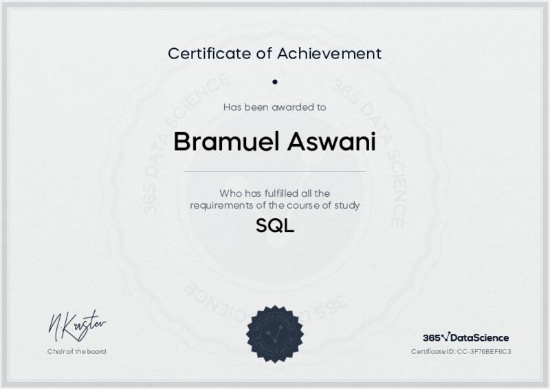 This user has been awarded the SQL Certificate for successfully completing the course exam. Holding this certificate demonstrates their proficiency on the topic and signifies they are qualified to apply their newly acquired expertise in the fields of data analytics and data science.