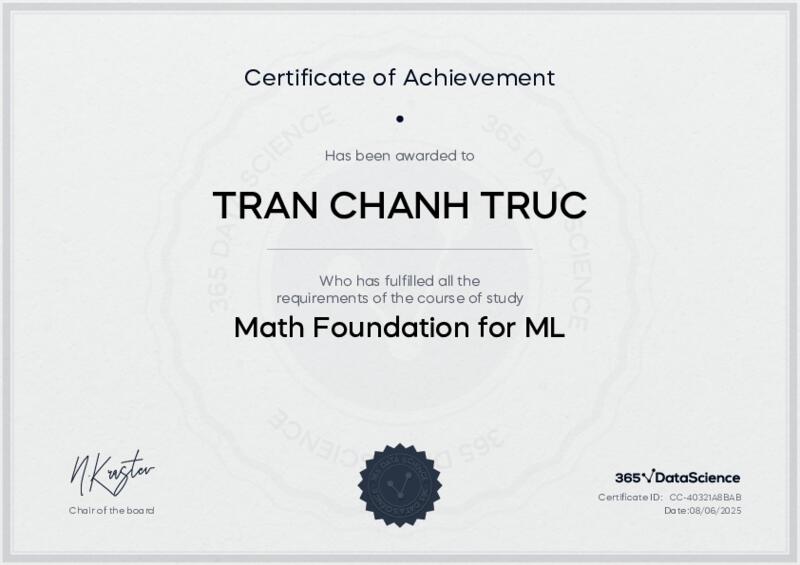 This user has been awarded the Math Foundation for ML Certificate for successfully completing the course exam. Holding this certificate demonstrates their proficiency on the topic and signifies they are qualified to apply their newly acquired expertise in the fields of data analytics and data science.