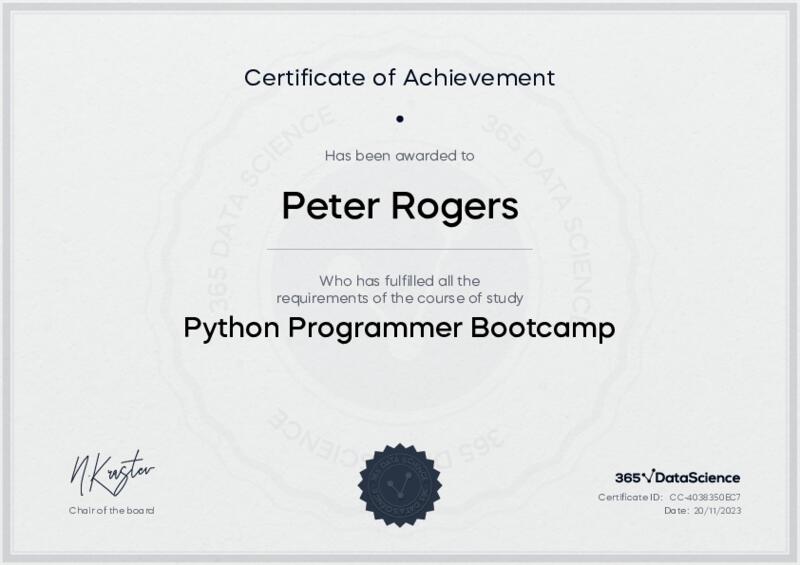 This user has been awarded the Python Programmer Bootcamp Certificate for successfully completing the course exam. Holding this certificate demonstrates their proficiency on the topic and signifies they are qualified to apply their newly acquired expertise in the fields of data analytics and data science.
