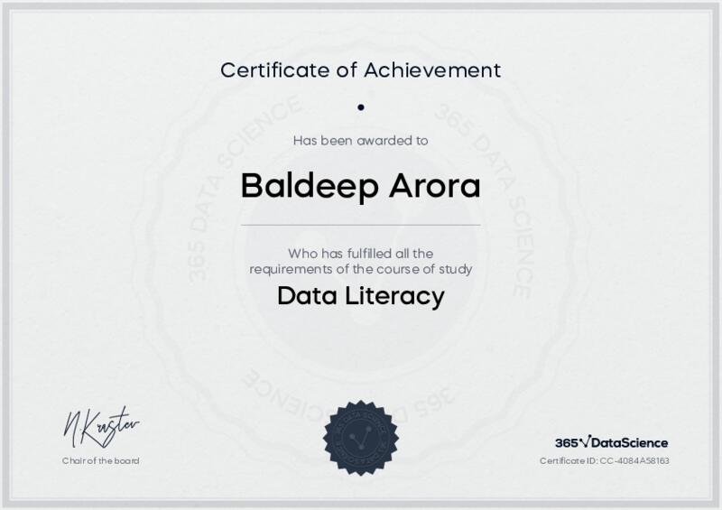This user has been awarded the Data Literacy Certificate for successfully completing the course exam. Holding this certificate demonstrates their proficiency on the topic and signifies they are qualified to apply their newly acquired expertise in the fields of data analytics and data science.