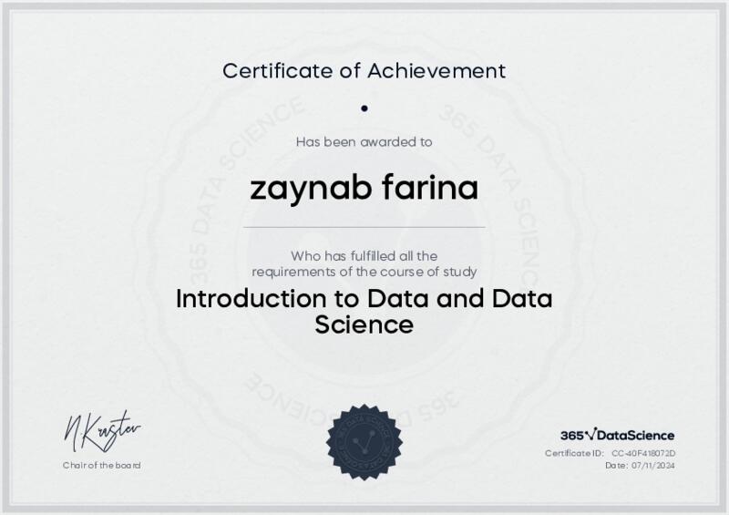 This user has been awarded the Introduction to Data and Data Science Certificate for successfully completing the course exam. Holding this certificate demonstrates their proficiency on the topic and signifies they are qualified to apply their newly acquired expertise in the fields of data analytics and data science.