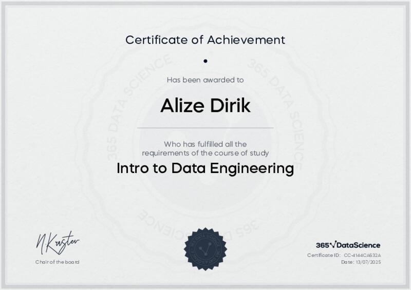 This user has been awarded the Intro to Data Engineering Certificate for successfully completing the course exam. Holding this certificate demonstrates their proficiency on the topic and signifies they are qualified to apply their newly acquired expertise in the fields of data analytics and data science.