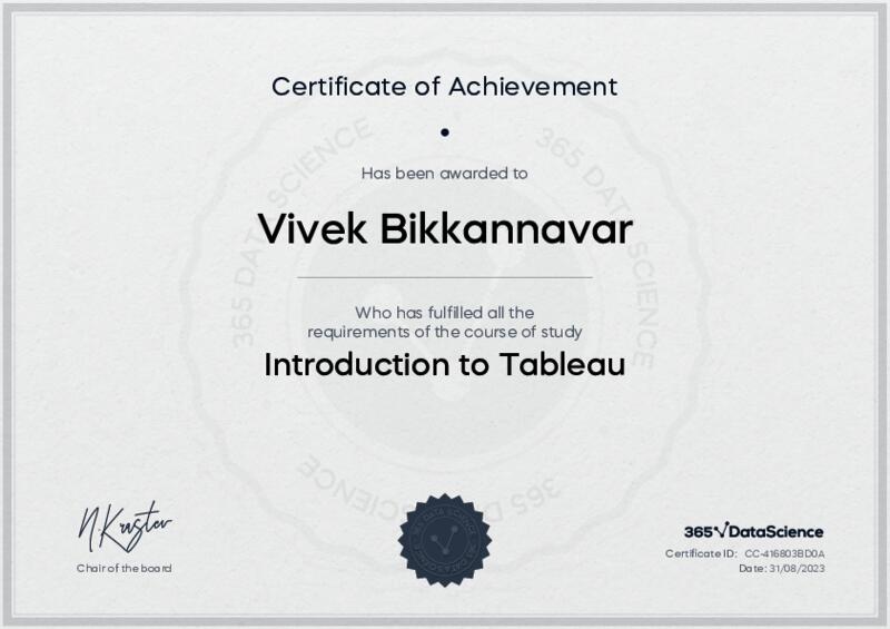 This user has been awarded the Introduction to Tableau Certificate for successfully completing the course exam. Holding this certificate demonstrates their proficiency on the topic and signifies they are qualified to apply their newly acquired expertise in the fields of data analytics and data science.