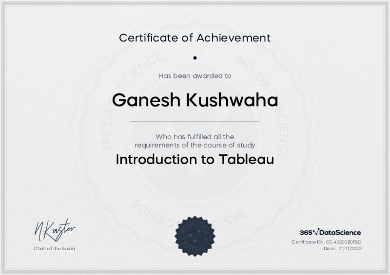 This user has been awarded the Introduction to Tableau Certificate for successfully completing the course exam. Holding this certificate demonstrates their proficiency on the topic and signifies they are qualified to apply their newly acquired expertise in the fields of data analytics and data science.