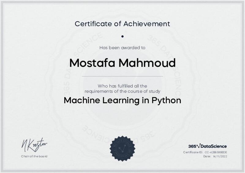 This user has been awarded the Machine Learning in Python Certificate for successfully completing the course exam. Holding this certificate demonstrates their proficiency on the topic and signifies they are qualified to apply their newly acquired expertise in the fields of data analytics and data science.
