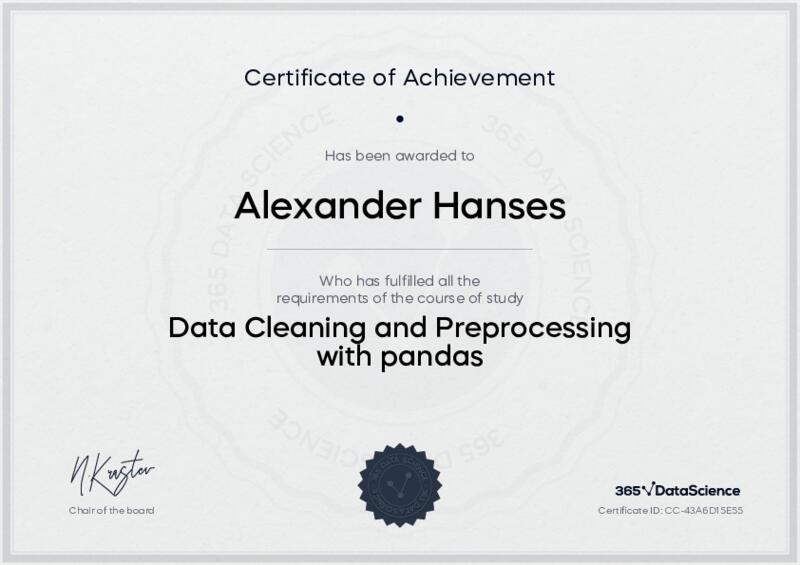 This user has been awarded the Data Cleaning and Preprocessing with pandas Certificate for successfully completing the course exam. Holding this certificate demonstrates their proficiency on the topic and signifies they are qualified to apply their newly acquired expertise in the fields of data analytics and data science.